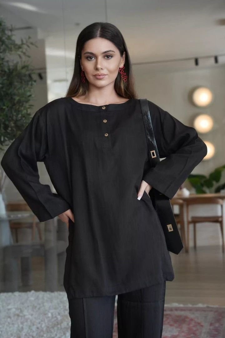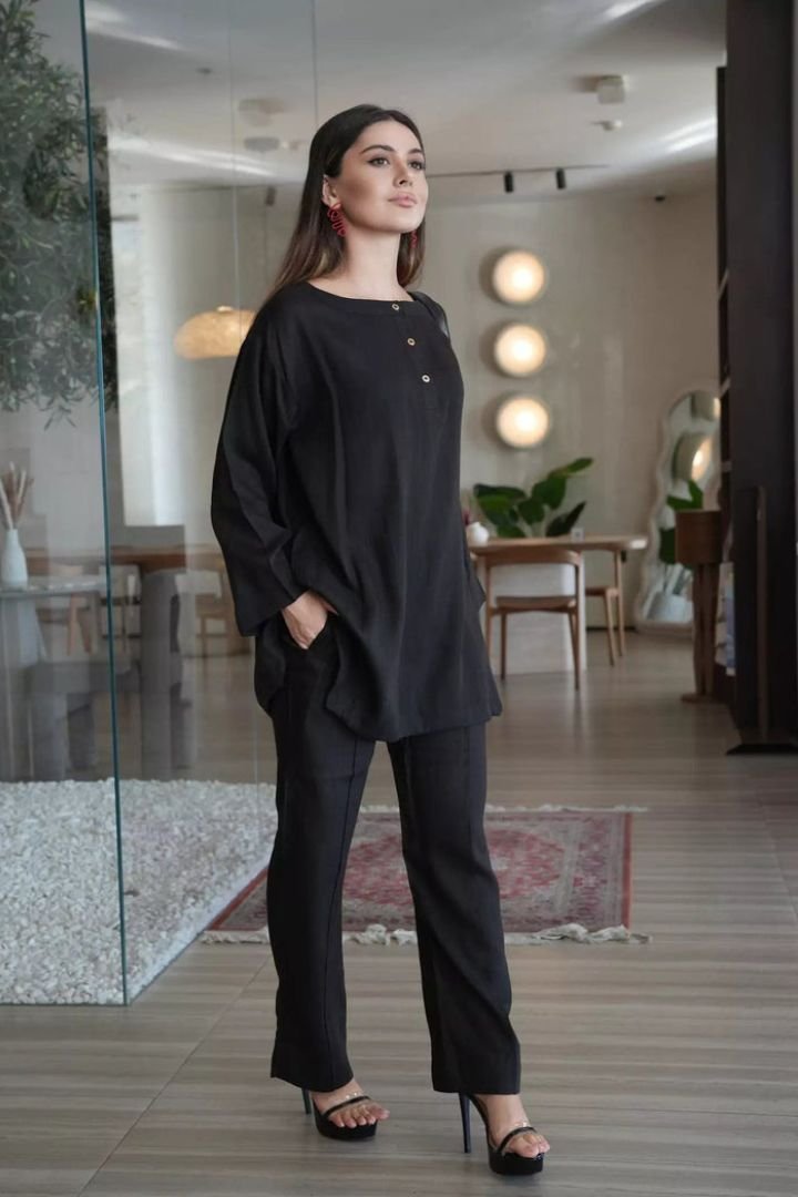 Be the first to review “Black solid cord-set trouser pocket. Branded stitching full suit over lock”
