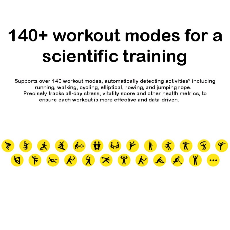 Fitness enthusiasts will appreciate its 24-hour health monitoring, covering heart rate, SpO2, and stress levels, along with 140+ workout modes that include running, cycling, and more, with auto-detection for selected exercises.