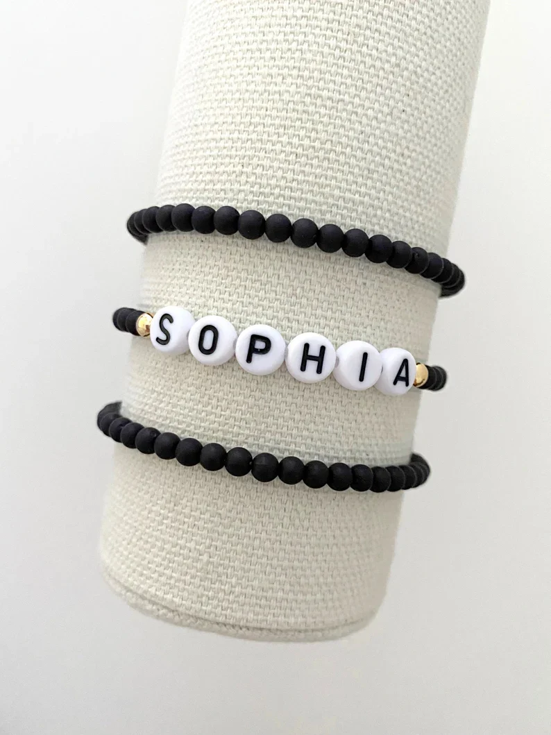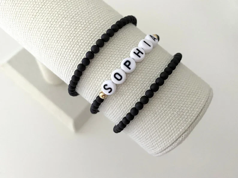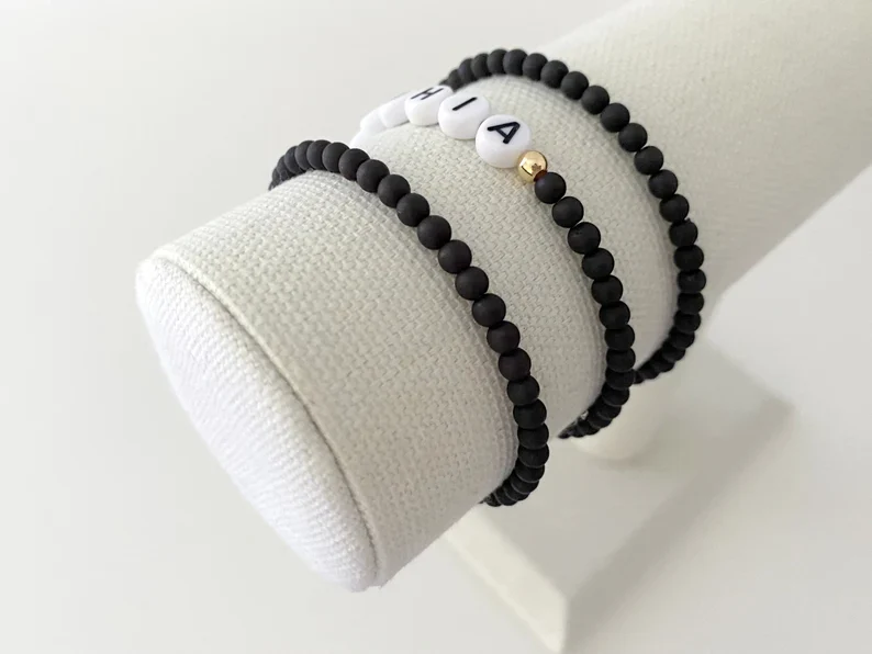 one name bracelet made with 4mm black matte beads with 14k gold accent beads on either side of the name