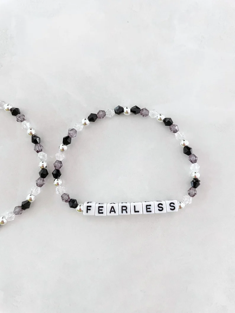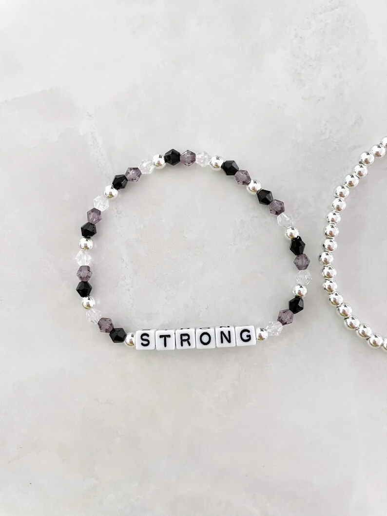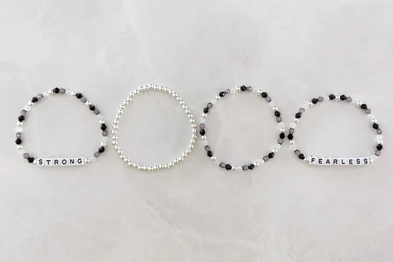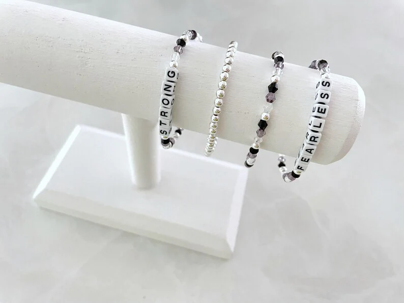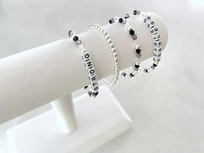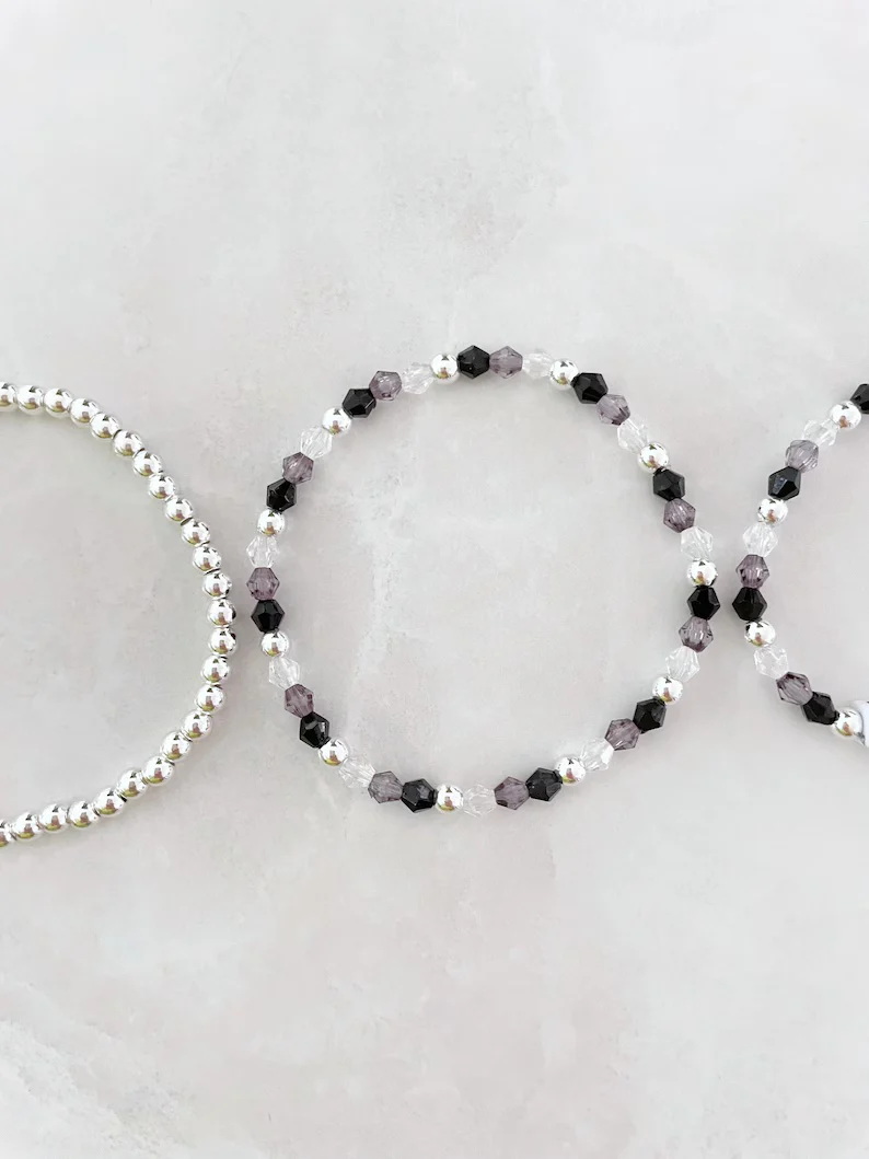 one square name bracelet made with 4mm sterling silver plated beads and 4mm crystal accent beads