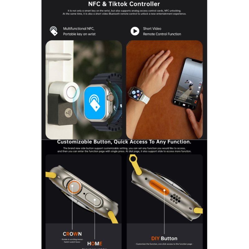 Convenience and utility: The smart drain function optimizes power consumption, ensuring the watch lasts when you need it most. Transform your W800 Ultra into a bedside clock or use it as an alarm clock. Control short videos remotely and set the time according to your preferences.