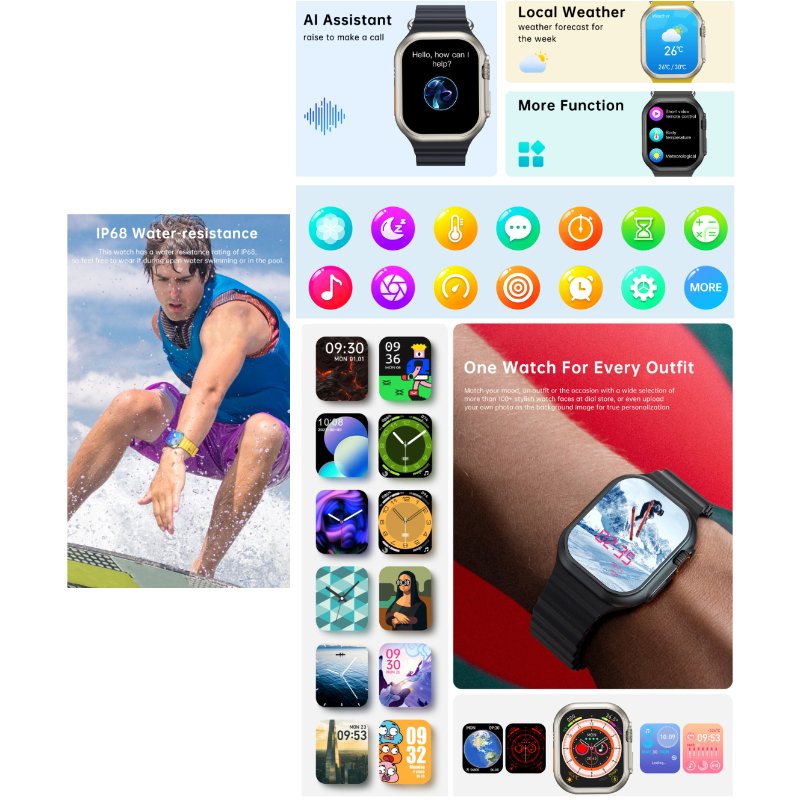 Connectivity at your fingertips: The W800 Ultra Smart Watch features Bluetooth phone capabilities, allowing seamless phone calls and messages directly from your wrist. Effortlessly switch between multiple watch faces to match your mood and outfit. With integrated WeChat and Alipay payment functions, make transactions securely and conveniently.