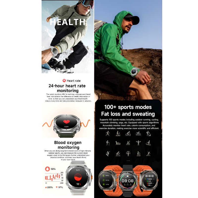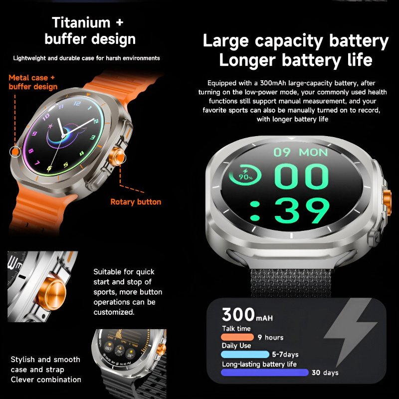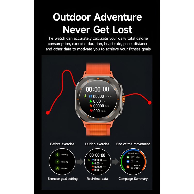 The Z7 Ultra Outdoor Smartwatch is crafted for adventure enthusiasts and fitness lovers, combining style with rugged durability. It features a 1.46-inch ultra-large HD screen with 360×360 resolution and a clear and immersive visual experience. Encased in a sturdy aluminum alloy frame with a buffer design, this watch is built to withstand harsh environments while maintaining a lightweight feel.
